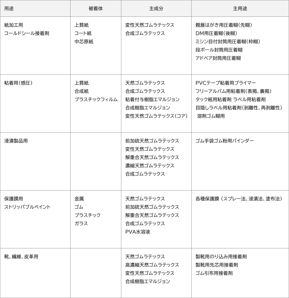用途別各種製品